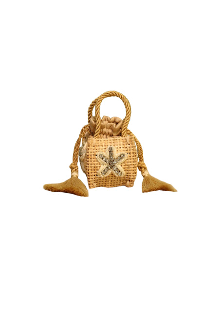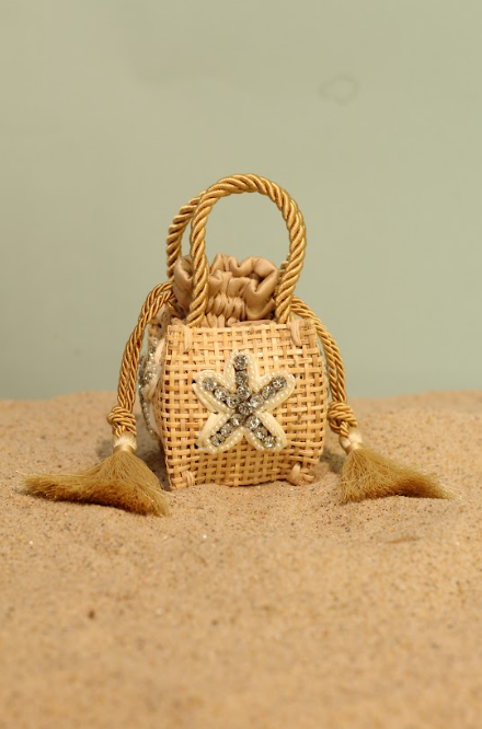 NA PEÇA NO FORMATO DE UMA ESTRELA E COM BORDADO DE RÁFIA NATURAL.
