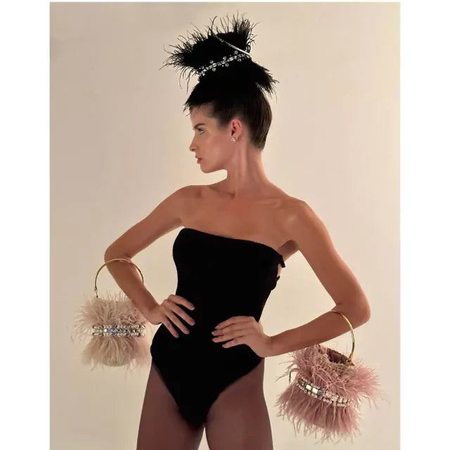 BOLSA EM CROCHÊ, COM FIO DE FIBRA NATURAL, ESTRUTURADA COM APLICAÇÃO DE CRISTAIS E PÉROLAS E FRANJAS DE PLUMAS NATURAIS. ALÇA DE MÃO EM RESINA METALIZADA. ALÇA DE OMBRO EM CORRENTE COM BANHO. FORRO EM CETIM PERSONALIZADO. DISPONÍVEL EM BEIGE, BLACK, OFF WHITE, BABY BLUE E ROSE.