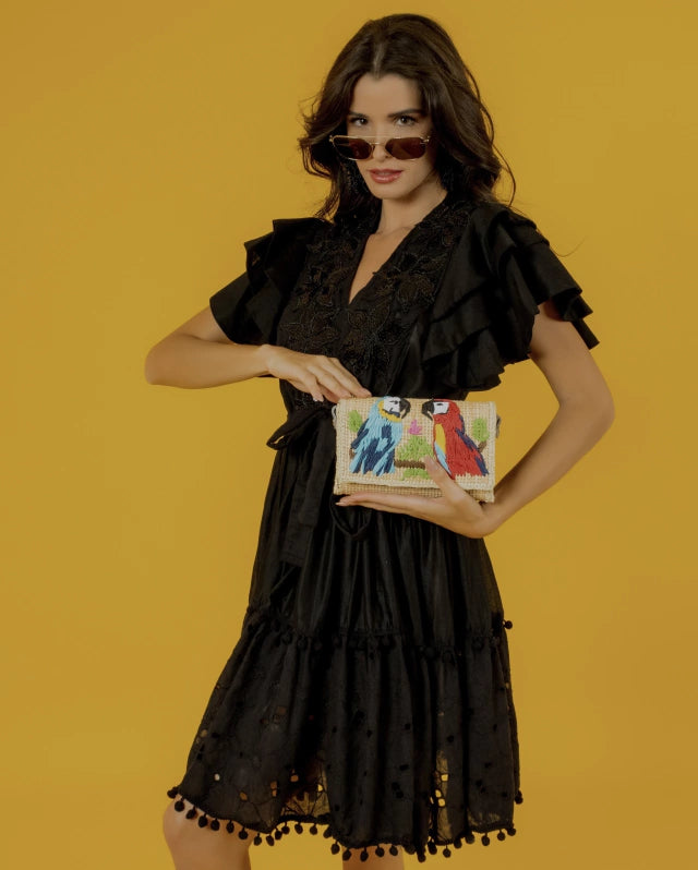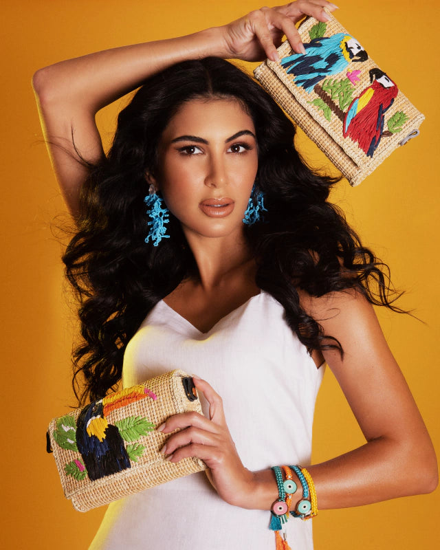 CLUTCH EM PALHA NATURAL RATTAN, E POSSUI BORDADO MANUAL DE ARARAS COM RÁFIA. VEM ACOMPANHADA DE ALÇA DE MÃO REMOVÍVEL EM RESINA E UMA ALÇA DE OMBRO AJUSTÁVEL E REMOVÍVEL DE TORÇAL. POSSUI FORRO EM VELUDO E FECHAMENTO COM BOTÃO DE PRESSÃO.