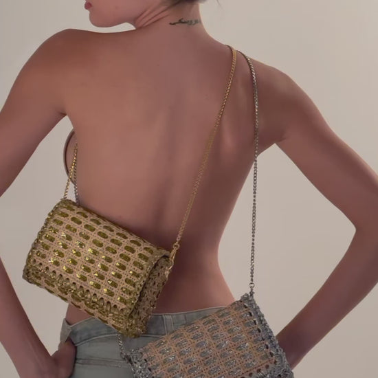 CLUTCH ESTRUTURADA EM PALHA NATURAL RATTAN COM APLICAÇÃO DE FITA LUREX COM GLITTER. VEM ACOMPANHADA DE UMA ALÇA DE MÃO EM PEDRAS DE RESINA E UMA ALÇA DE OMBRO EM CORRENTE DE METAL BANHADA OU COURO: TODOS REMOVÍVEIS. FECHAMENTO COM BOTÃO DE PRESSÃO. POSSUI FORRO INTERNO EM TECIDO AVELUDADO. DISPONÍVEL NAS CORES SILVER, GOLD E BLACK.