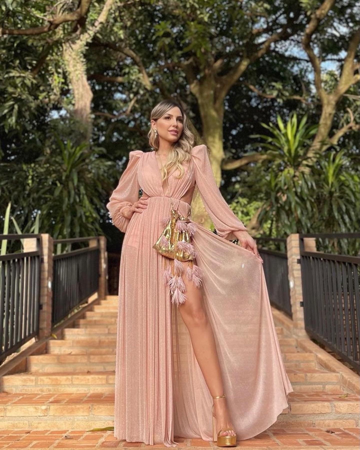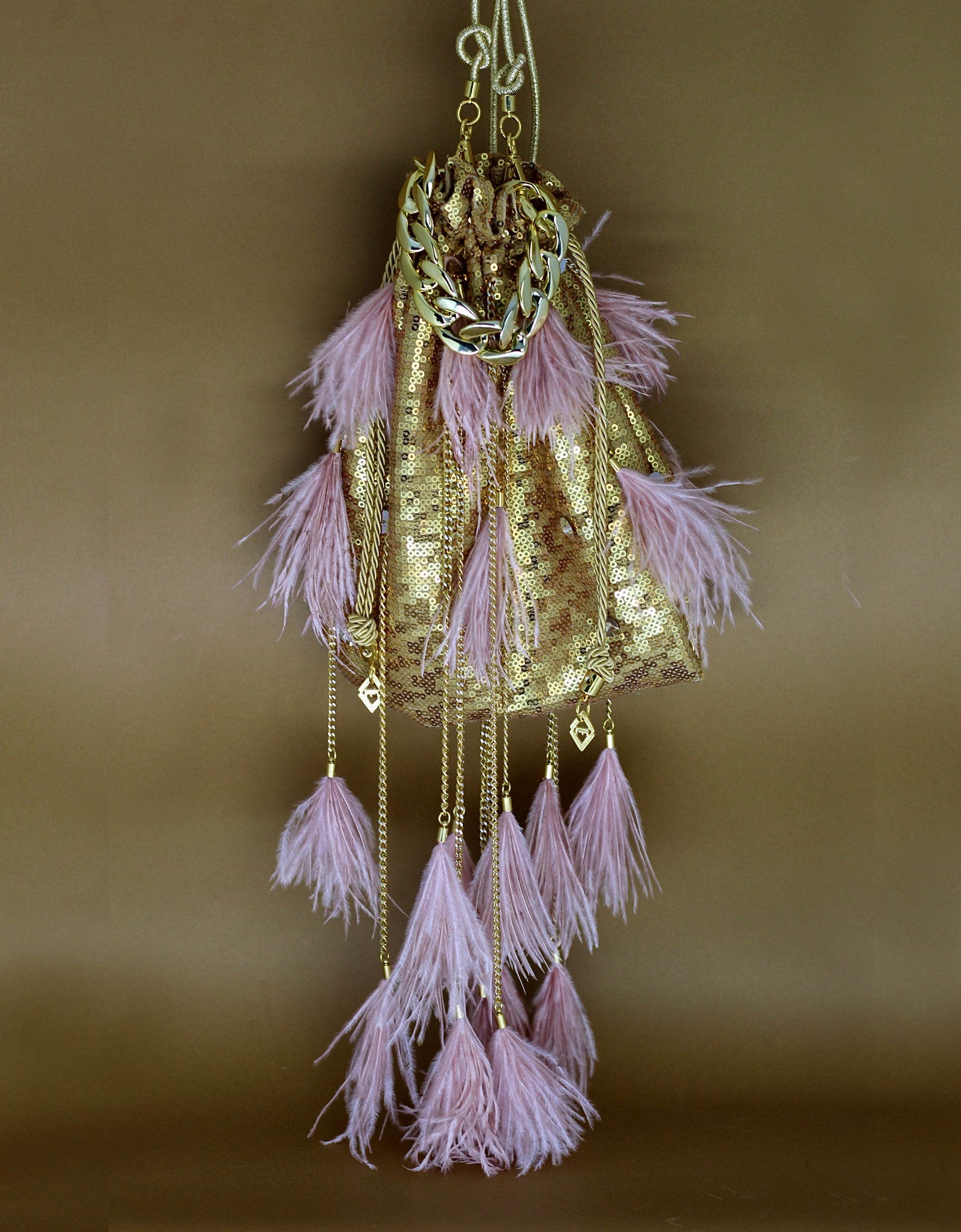 BOLSA ESTILO SACO EM TECIDO EM PAETÊ COM APLICAÇÃO DE PINGENTES DE PLUMAS E MINI CRISTAIS, APLICAÇÃO DE CORRENTES COM PINGENTES DE PLUMAS QUE DÃO MOVIMENTO À BOLSA. FECHAMENTO COM TORÇAL. FORRO EM SÊDA. ALÇA DE OMBRO E MÃO EM CORRENTE COM BANHO.