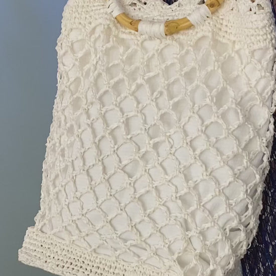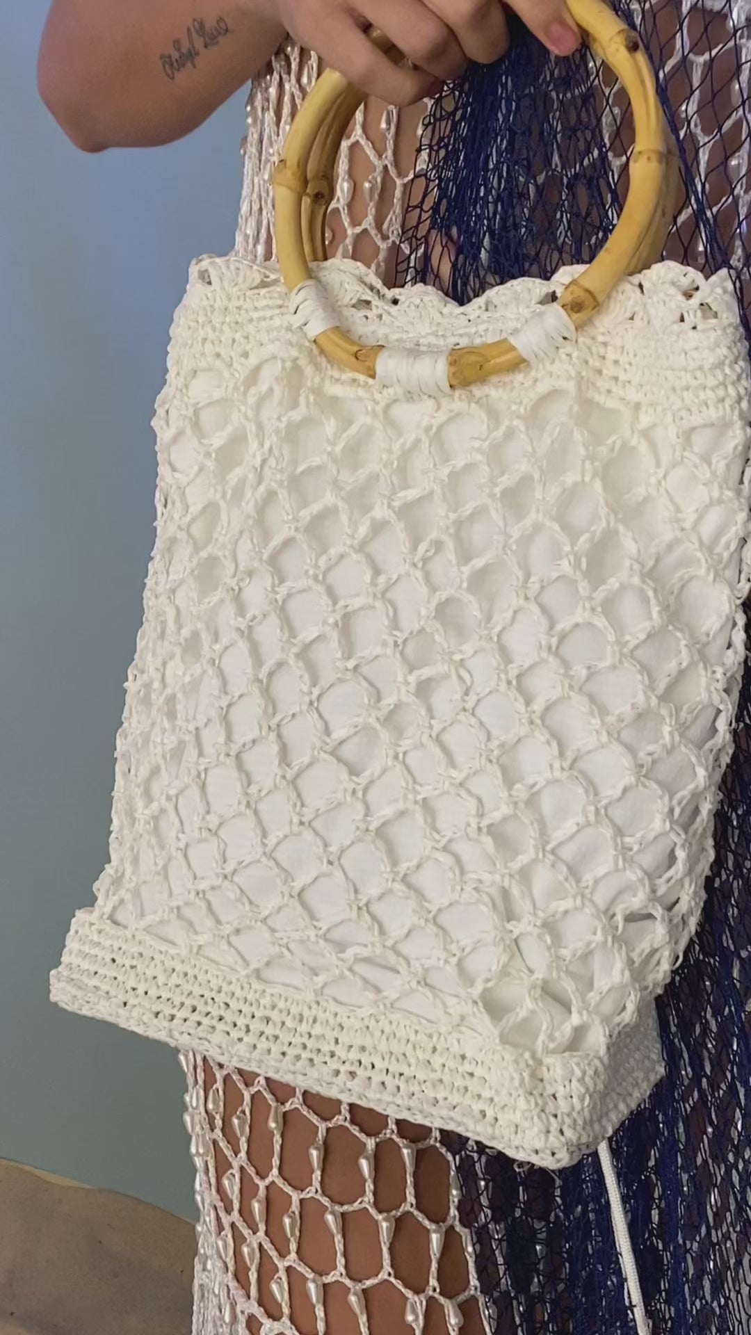 CLUTCH EM CROCHÊ COM FIO DE RÁFIA E COM FUNDO EM PALHA. ELA VEM COM FORRO DE CETIM E FECHAMENTO COM BOTÃO IMÃ. POSSUI ALÇAS DE MÃO EM BAMBU E ALÇA DE OMBRO AJUSTÁVEL E REMOVÍVEL EM METAL COM BANHO ITALIANO, QUE PODE TAMBÉM SER USADA NA TRANSVERSAL.