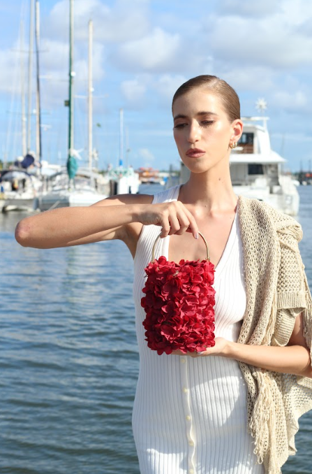 EM COURO. ADORNADA COM FLORES DE TECIDO E MINI CRISTAIS TCHECOS