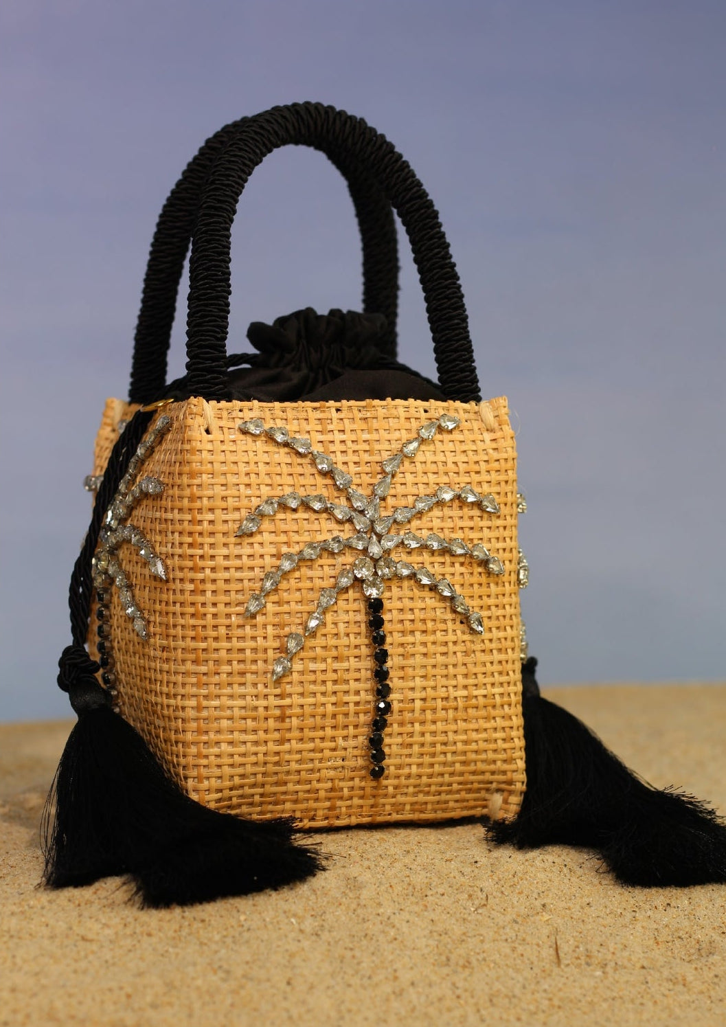 SÃO CUIDADOSAMENTE COSTURADAS À MÃO NA PEÇA, EM FORMATO DE COQUEIRO.