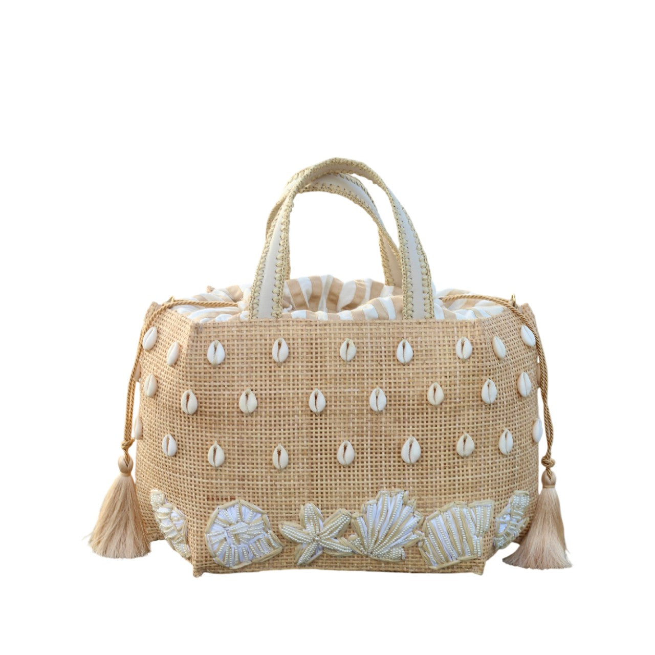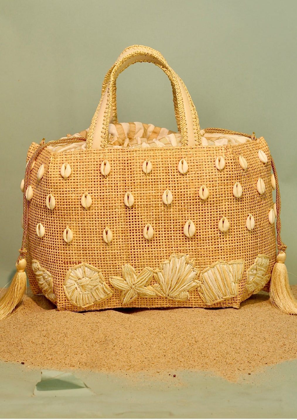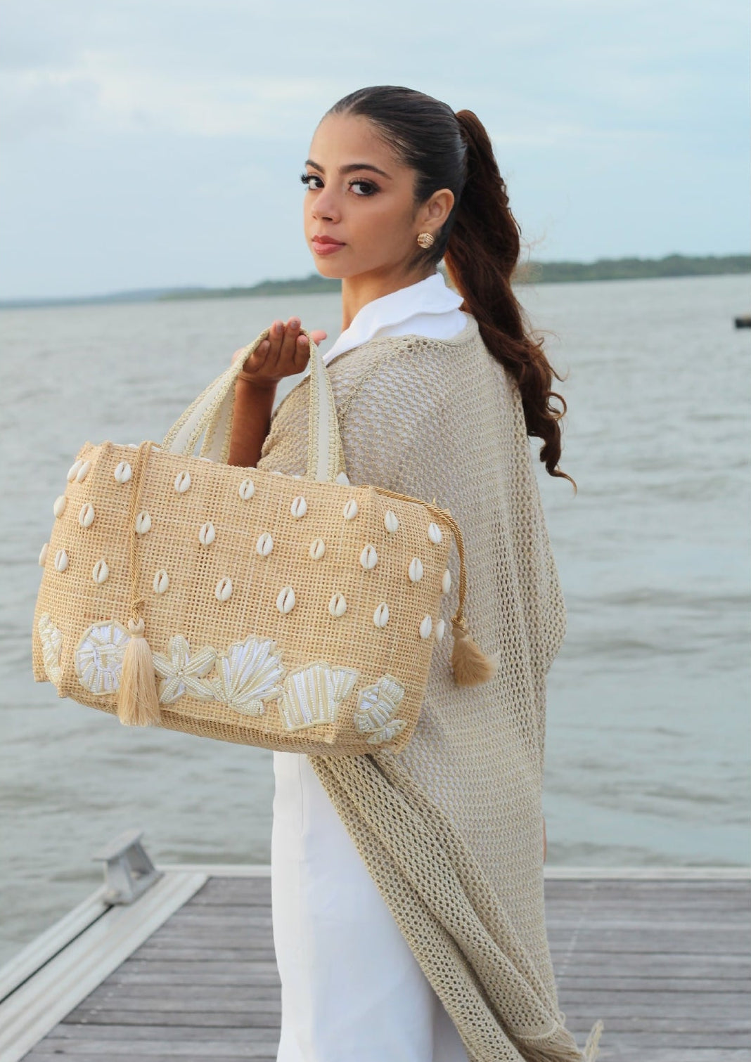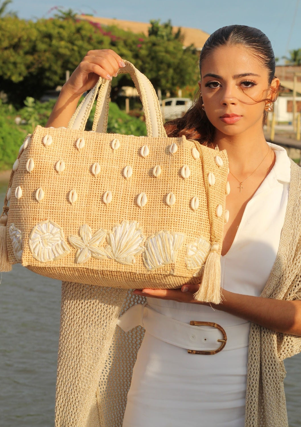 ALÉM DISSO, A BOLSA É EMBELEZADA COM BORDADOS MANUAIS COM RÁFIA