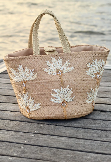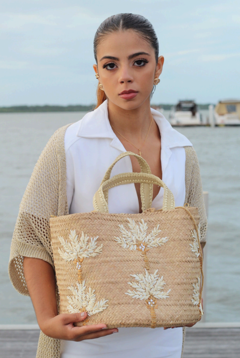 CARNAÚBA É BORDADA À MÃO COM RÁFIA NATURAL. POSSUI FORRO EM CETIM
