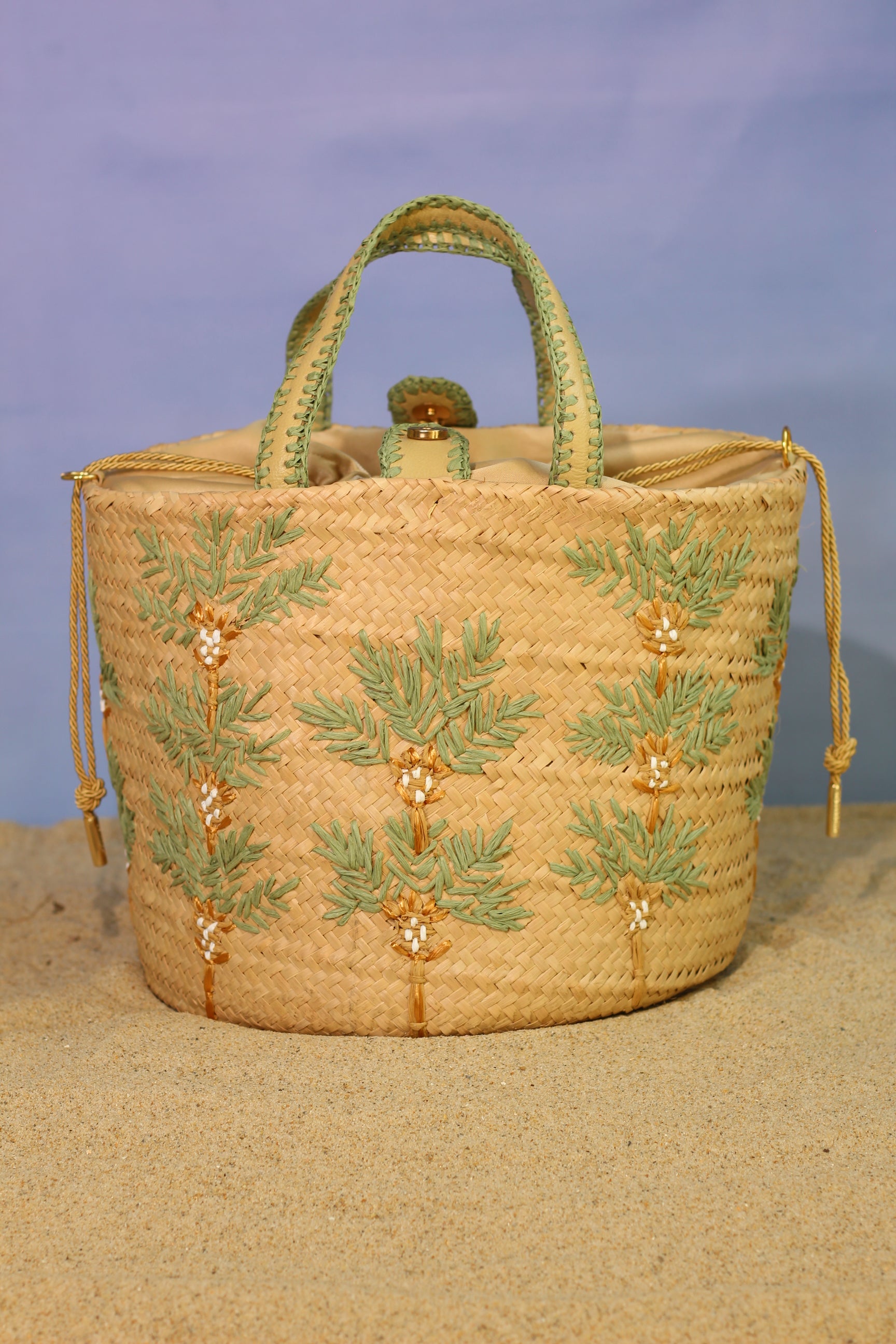 CARNAÚBA É BORDADA À MÃO COM RÁFIA NATURAL. POSSUI FORRO EM CETIM