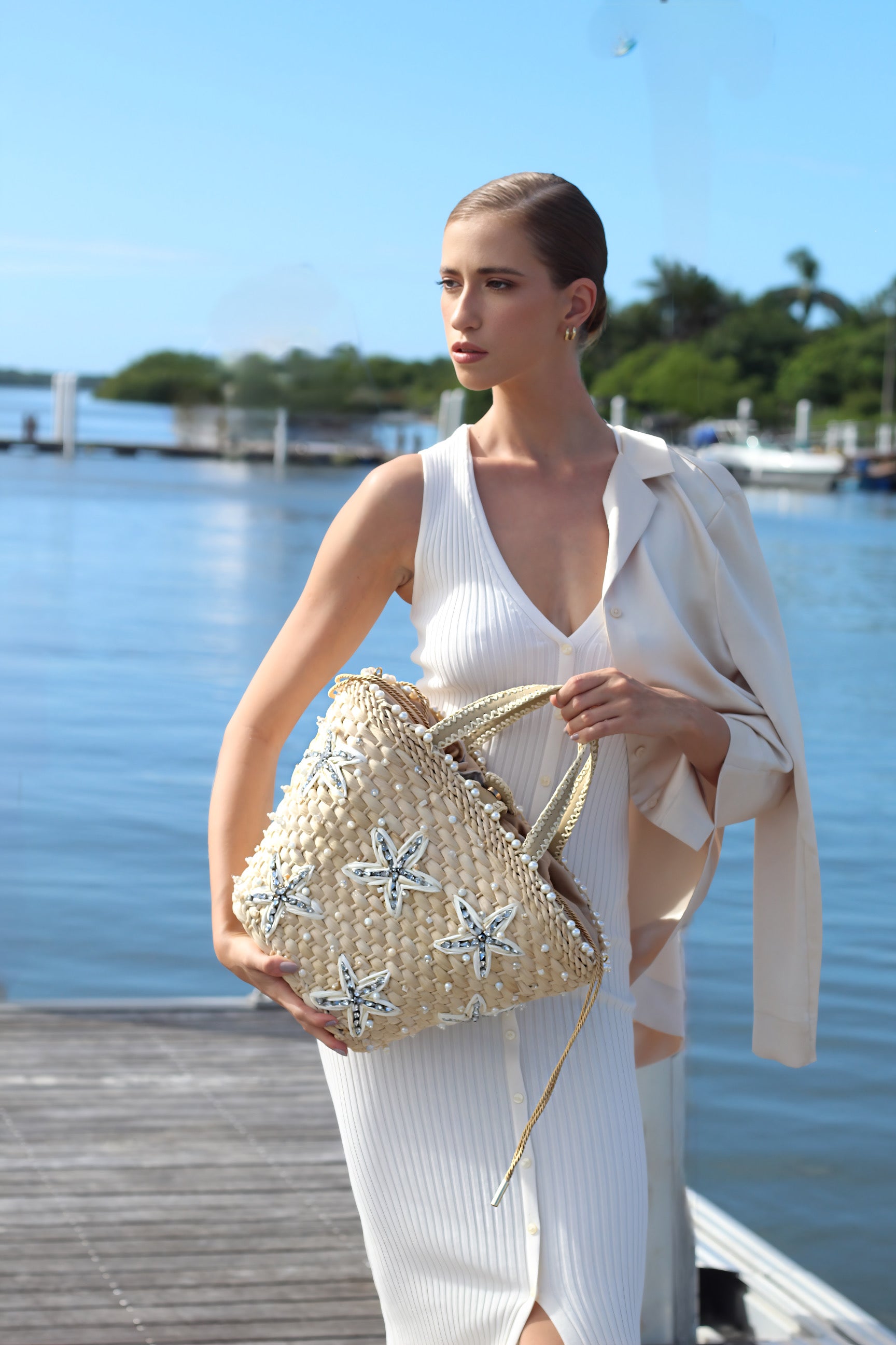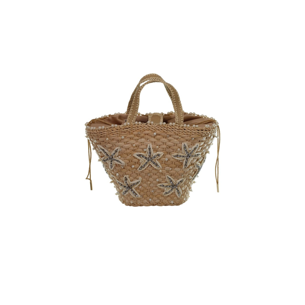 BOLSA DE PALHA NATURAL, ADORNADA COM CROCHÊ DE RÁFIA, CRISTAIS