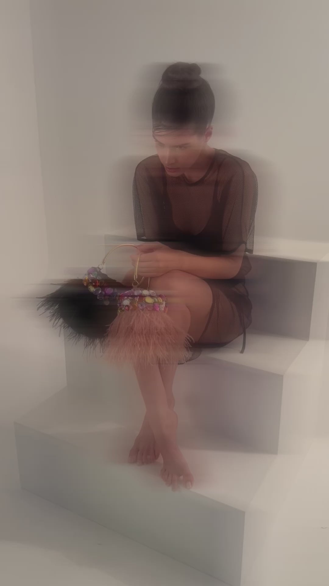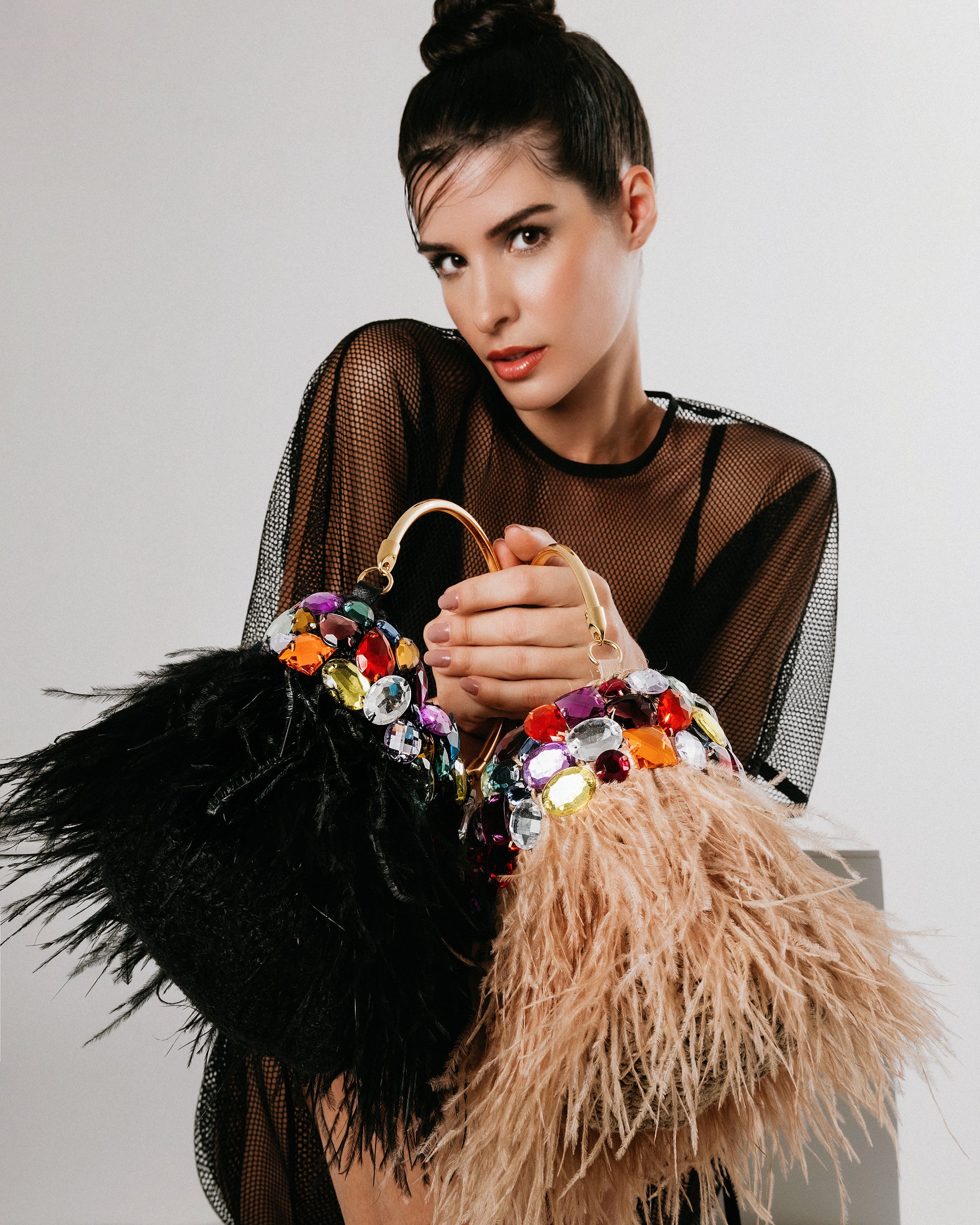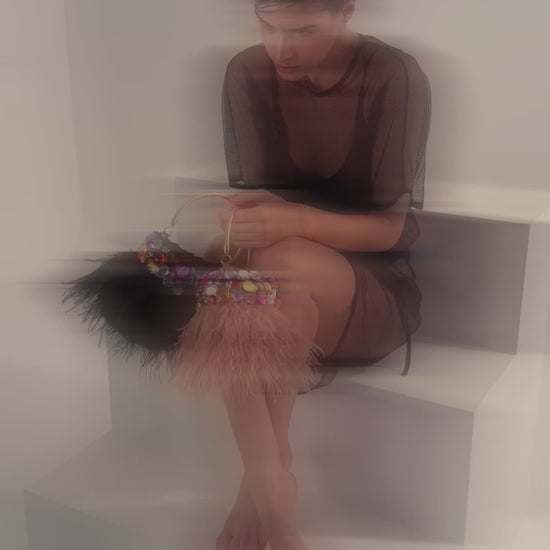 BOLSA EM CROCHET COM FIO DE FIBRA NATURAL ESTRUTURADA COM APLICAÇÃO DE CRISTAIS ASSIMÉTRICOS COLORIDOS POR TODA SUA CIRCUNFERÊNCIA E FRANJAS DE PLUMAS NATURAIS, ALÇA DE MÃO E DE OMBRO EM METAL COM BANHO. FORRO EM CETIM. DISPONÍVEL EM BEIGE E BLACK.