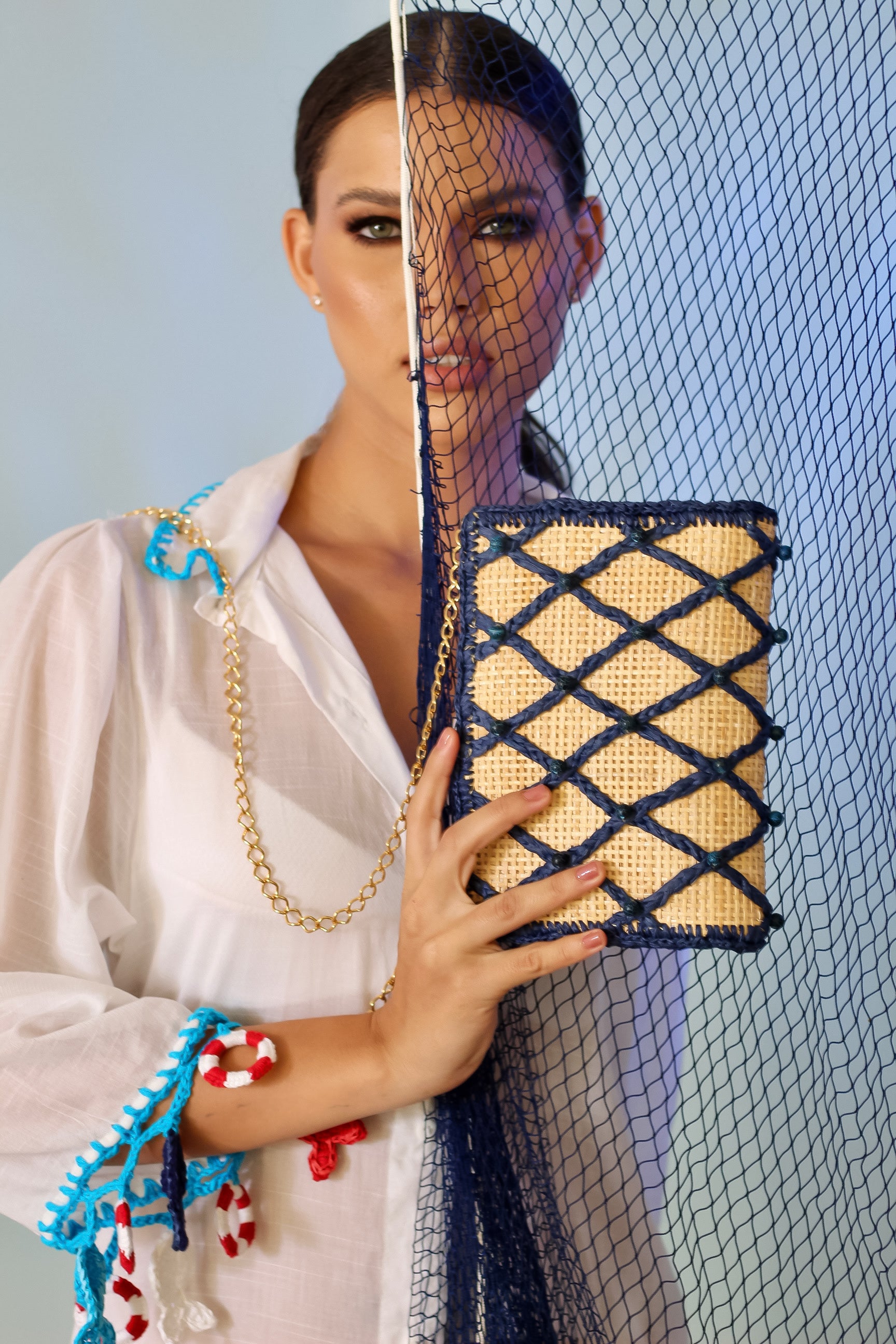 A CLUTCH JEWEL AGATE É FEITA COM UMA UNIÃO ENTRE RATTAN NATURAL E PALHA DE BURITI, DESENVOLVENDO UM MATERIAL VISUALMENTE DELICADO, MAS RESILIENTE. POSSUI BORDADOS EM RÁFIA E É ADORNADO POR GEMAS DE ÁGATA NATURAIS. TAMBÉM POSSUI UMA ALÇA DE OMBRO REMOVÍVEL LONGA DE METAL DOURADO COM BANHO, QUE PERMITE O USO NO OMBRO OU TRANSVERSAL, E INTERNAMENTE É COBERTA COM COURO NATURAL. A ÁGATA É UMA VARIEDADE DE CALCEDÔNIA NATURAL QUE OCORRE EM FAIXAS DE CORES VARIADAS E SUA TRANSPARÊNCIA LEMBRA OS CÍRCULOS CONCÊNTRICOS TÍPICOS DAS ÁGUAS NO CENTRO DOS ATOLÕES DO PACÍFICO. MAIS UMA ADIÇÃO À COLEÇÃO DE JÓIAS DA MARCA, ONDE GEMAS, MINERAIS SEMIPRECIOSOS E ZIRCÔNIAS CÚBICAS SÃO COMPOSTAS COM A PALHA NATURAL. DISPONÍVEL NAS CORES BLUE E BEIGE.