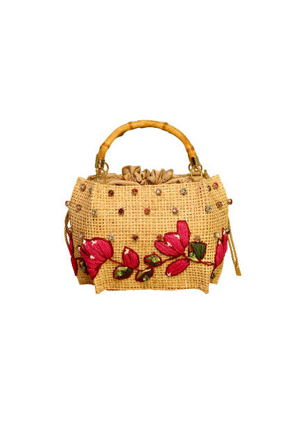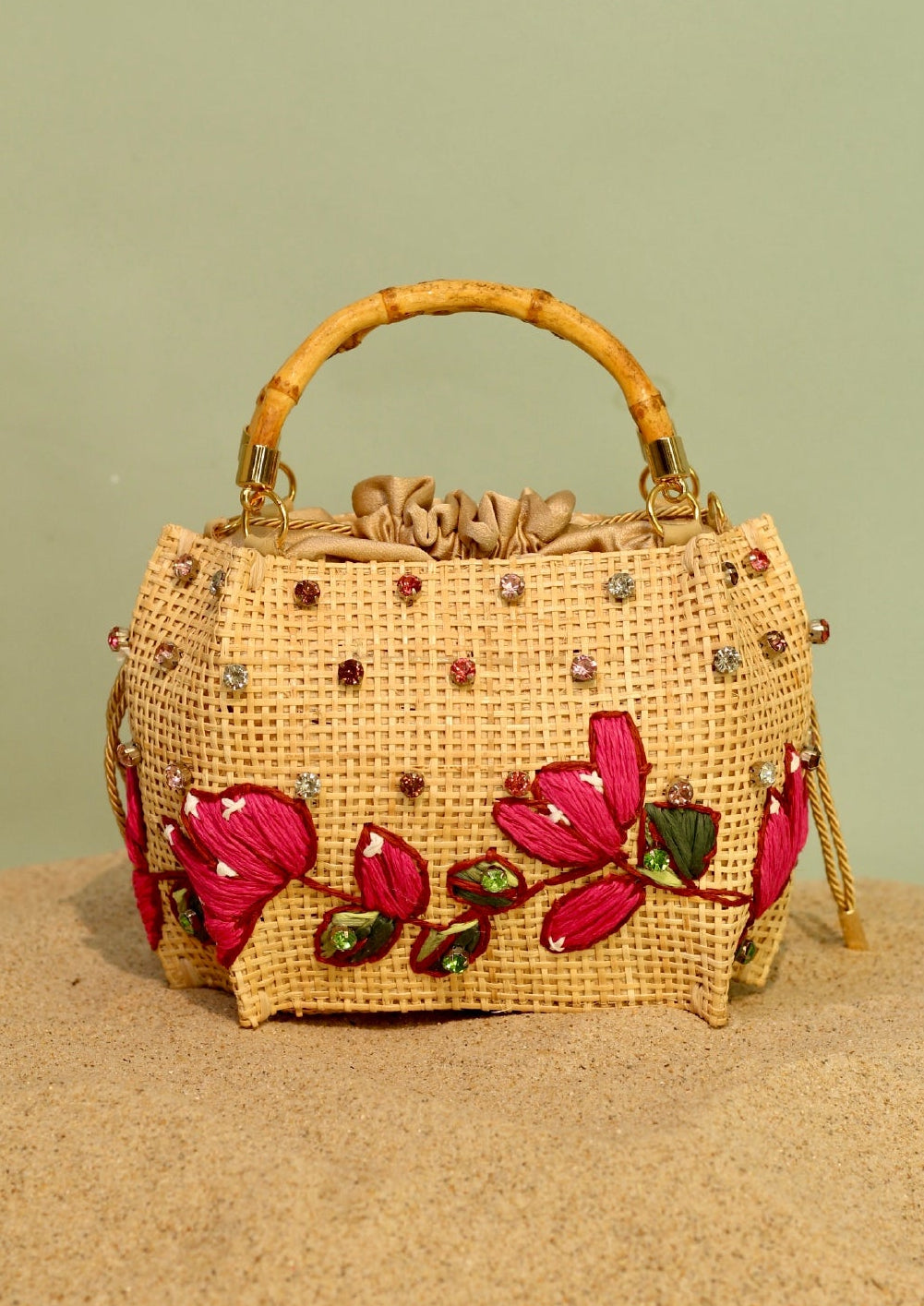 BORDADOS DE RÁFIA NATURAL. FORRO EM LINHO. POSSUI ALÇAS DE MÃO EM BAMBU